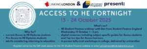 Are you an Access or Pre-Access student wanting to know more about how HE student finance works?’ Linking London are offering a free lunchtime webinar on HE Student Finance which is tailored to Access students on Wednesday 15th October 1-2pm. Click here to Register to attend on Teams. If you cannot attend but would like to be sent the recording, please also sign up to the link and we will send the recording after.