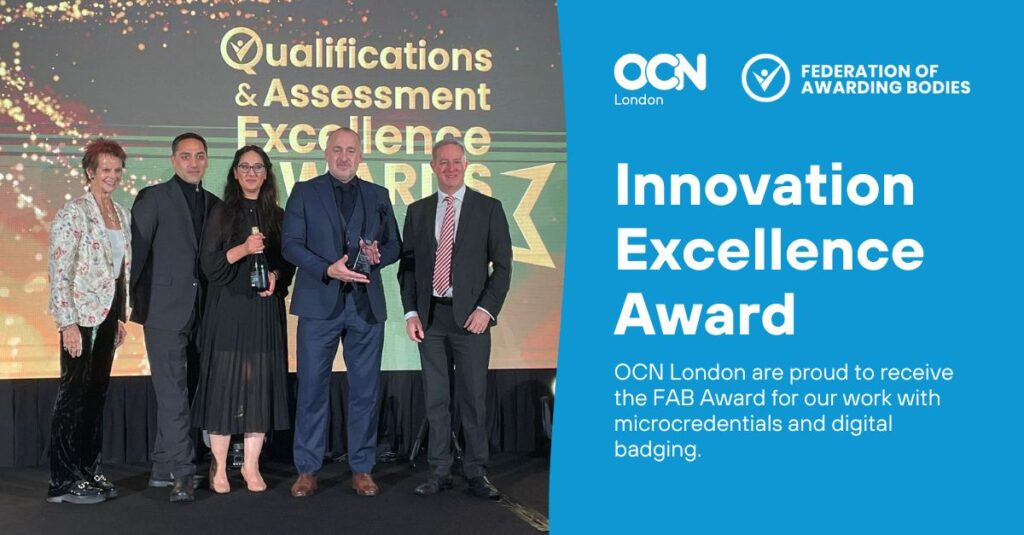OCN London has received two significant industry awards that recognise our commitment to modern, flexible and credible skills recognition. This year, we were awarded the London Chamber of Commerce and Industry SME Business Innovation Award and the Federation of Awarding Bodies Innovation Excellence Award.